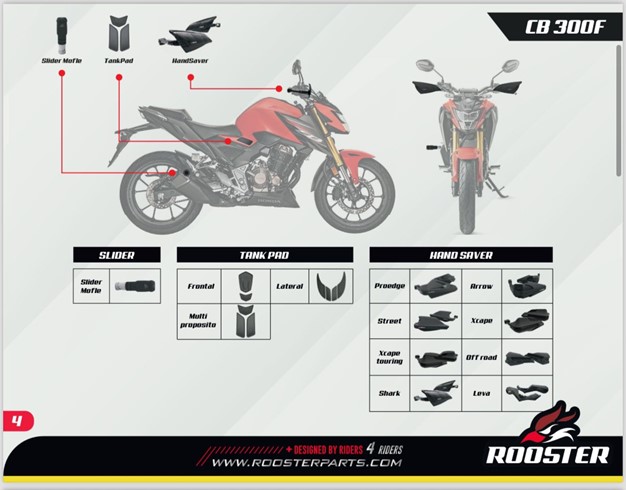 EN ROOSTER encontraras HandSavers (protección para manos/puños/hombros), Sliders (protección de piernas y Mofle), Tank Pads (protección de piernas y de la moto), y Prendas de Protección-Rooster Wear (Chaquetas-Impermeables-Pantalon-Jersey-Buff) para que ruedes seguro, tranquilo y con estilo. Para conocer todos los detalles que tiene ROOSTER preparado para la HONDA CB 300F ingresa aquí a este enlace